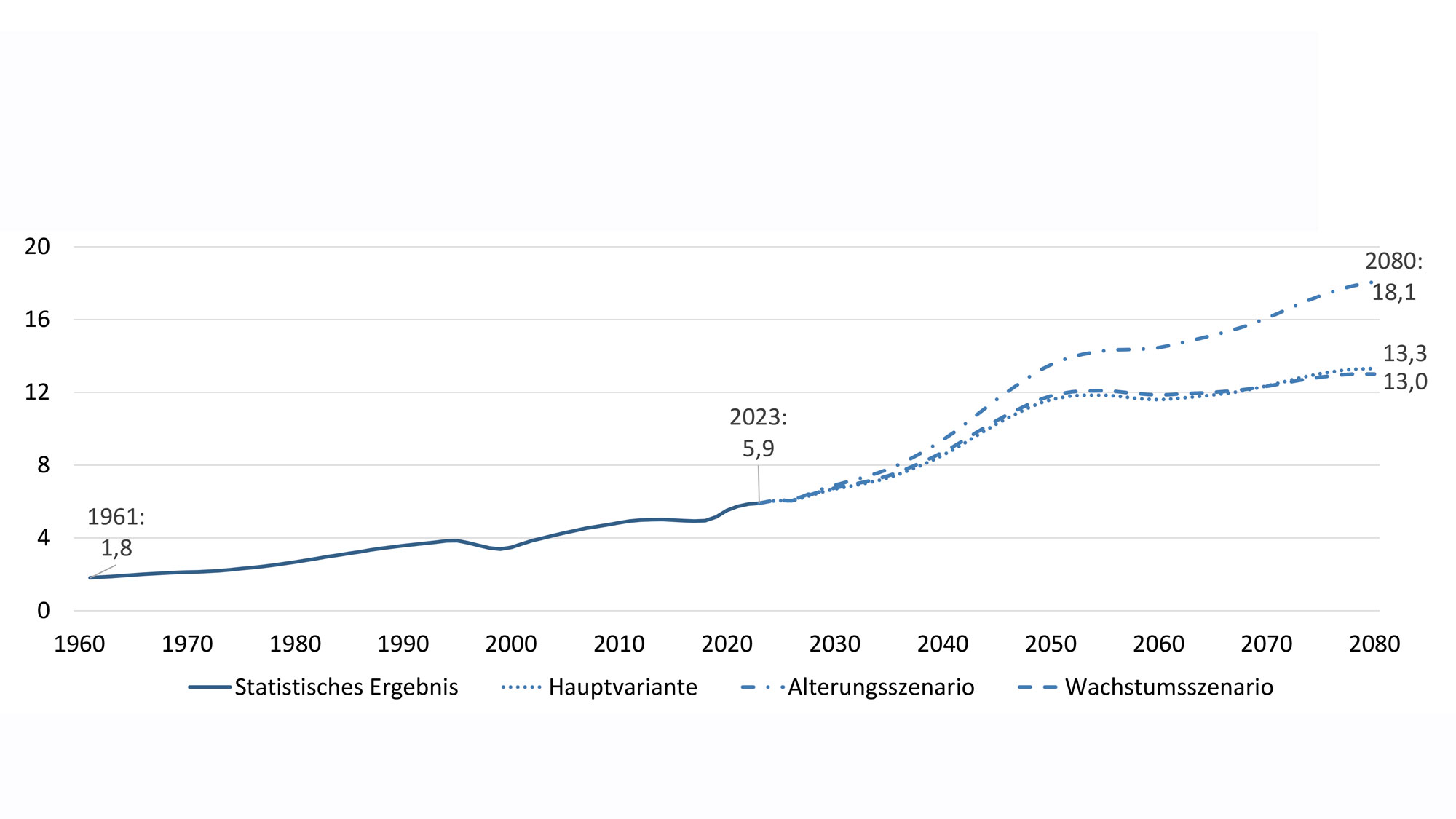 Anteil der Personen über 80 Jahre von 1961-2023 in Prozent der Gesamtbevölkerung sowie Prognosen bis 2080 gemäß dem Wachstumsszenario (gestrichelte Linie), der Hauptvariante (gepunktete Linie) und dem Alterungsszenario (gestrichelt-gepunktete Linie).