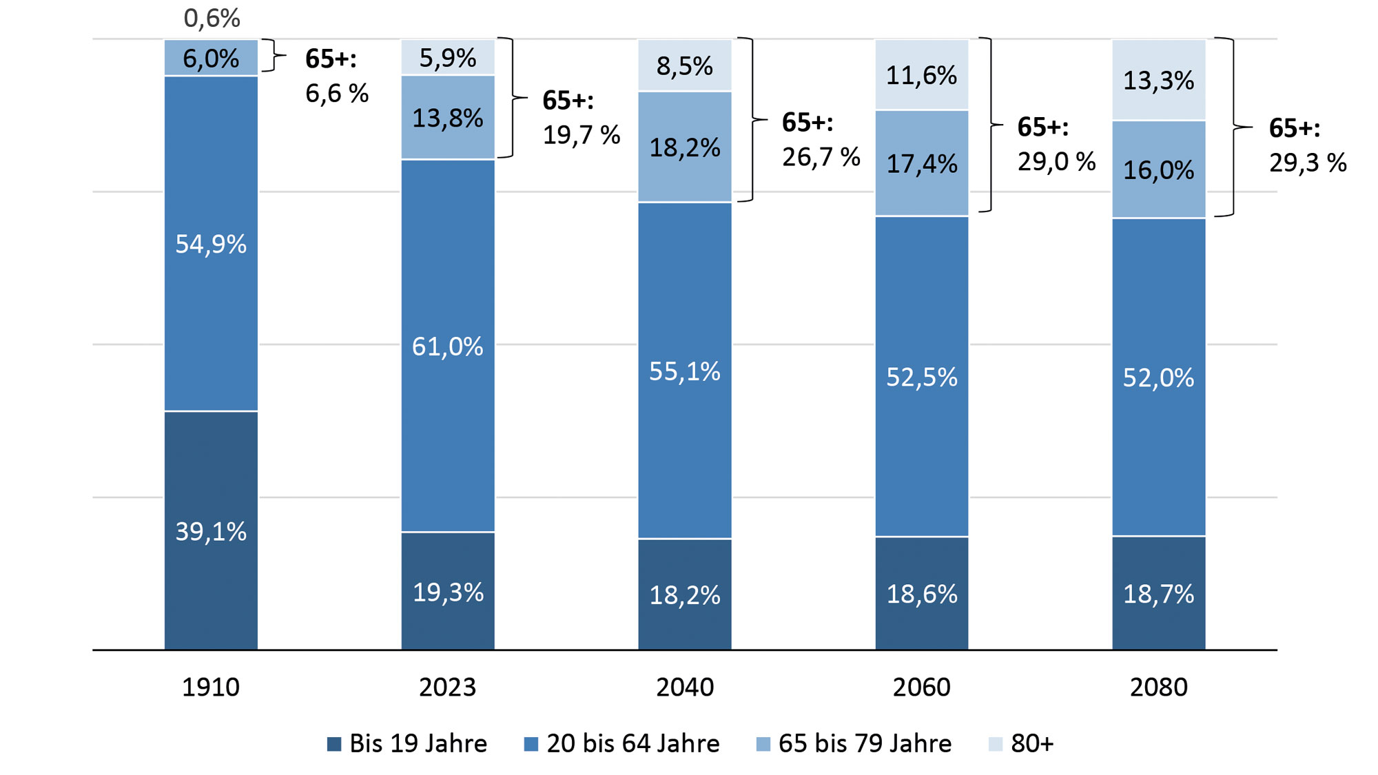 Bevölkerungsstruktur nach Alterskohorten in den Jahren 1910 und 2023 sowie Prognosen für 2040, 2060 und 2080 in Prozent.