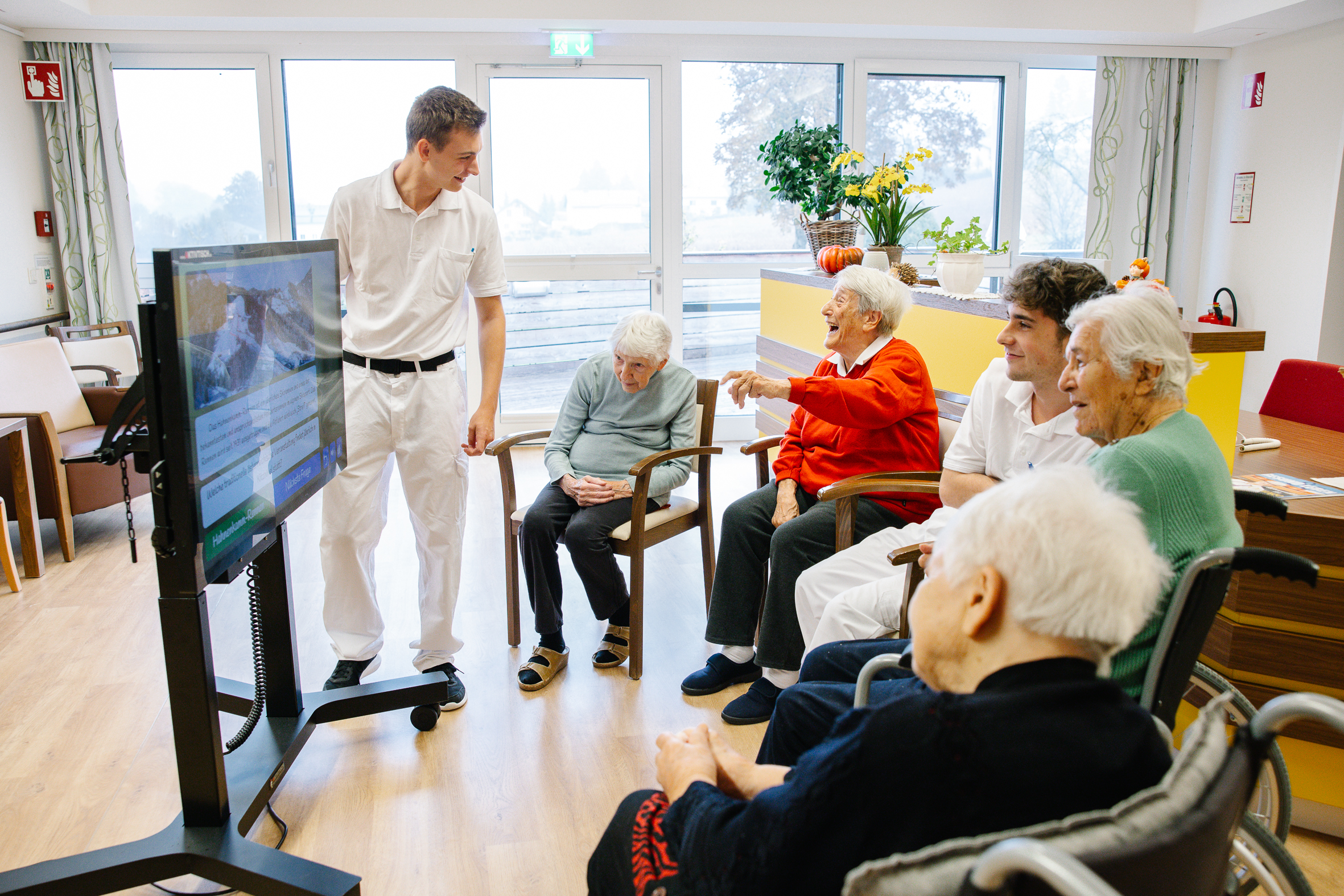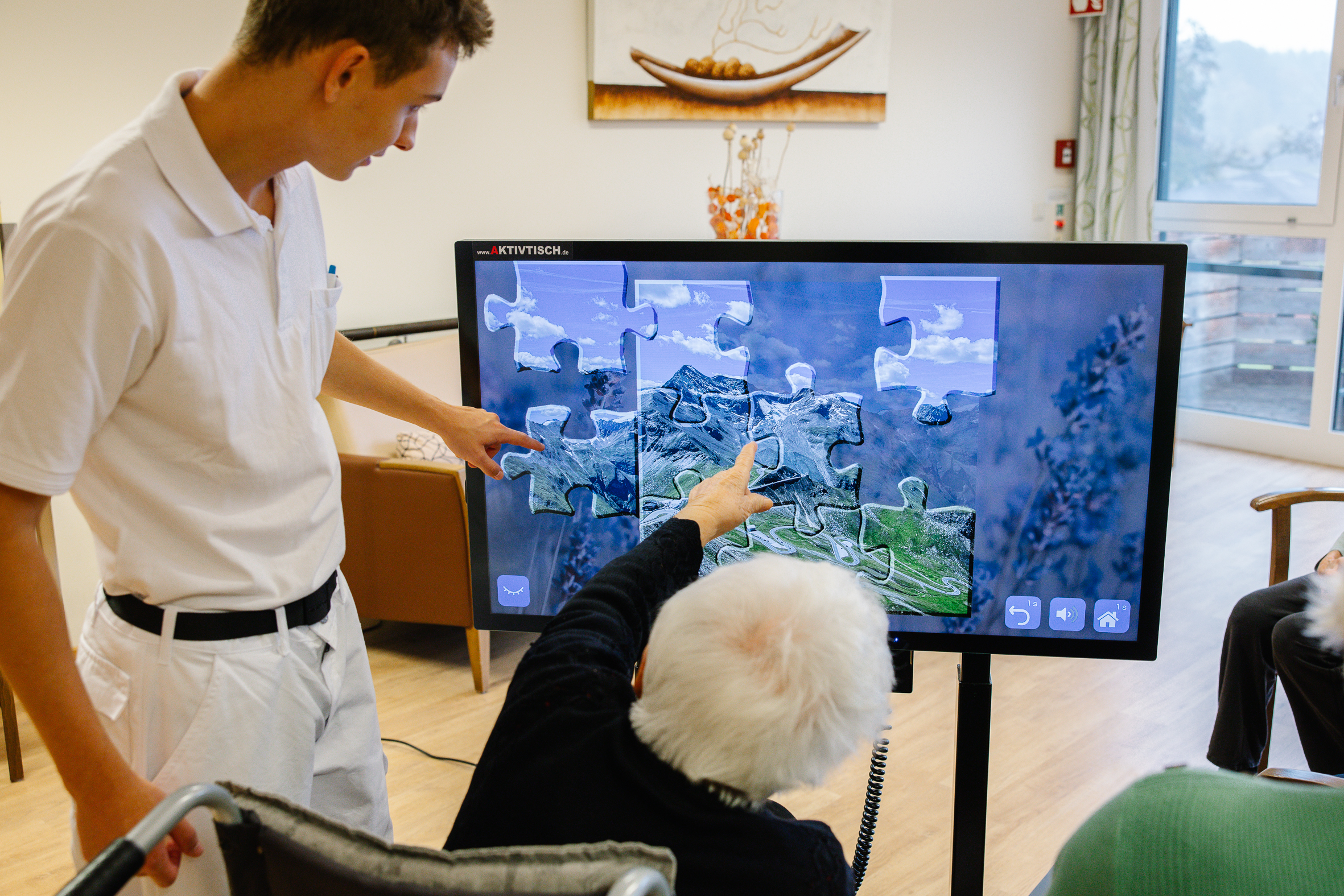 Die Bewohner*innen im Seniorenwohnen St. Louise testen einen neuen, digitalen Aktivtisch zum Spielen, Malen, Puzzeln, Rätseln und Entspannen. Das Board hat viele unterschiedliche Funktionen und wird von den Seniorinnen und Senioren begeistert genutzt – für jede und jeden ist etwas dabei. Digitale Angebote wie der Aktivtisch schaffen geistige Anreize für die Senior*innen, trainieren ihre Reflexe und fördern die Gemeinschaft. Zusammen rätseln und spielen bringt Abwechslung und Lebensfreude in den Alltag.